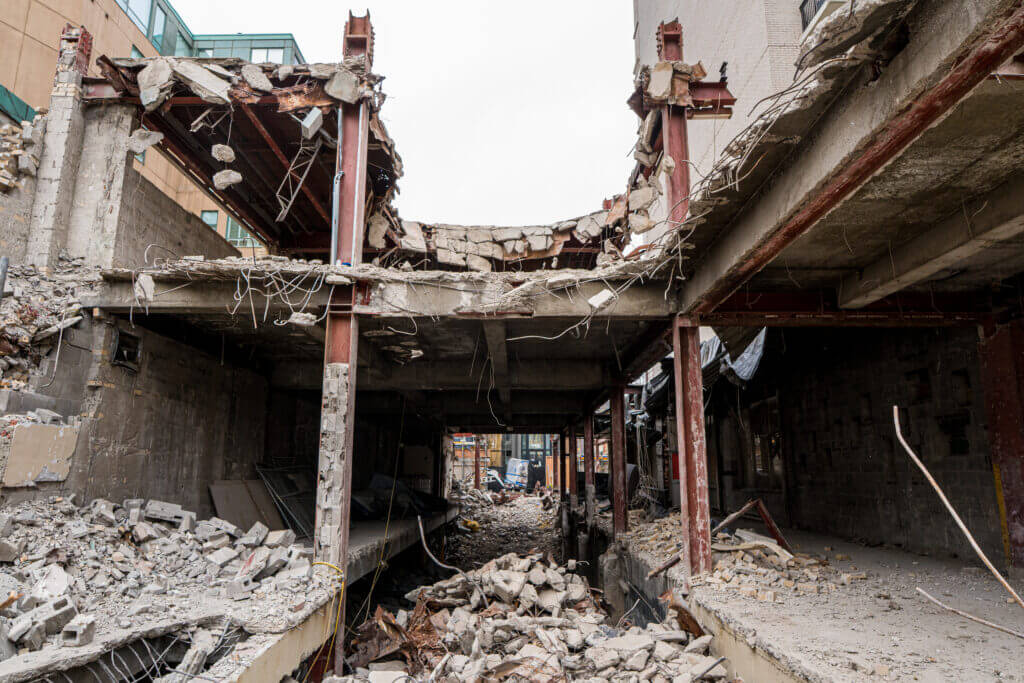 The challenge was space—there was no space between 89 Avenue road and the neighbouring buildings. In order to utilize our equipment safely in this tight space, machines were driven through the building so that the structure could be demolished from the inside out.