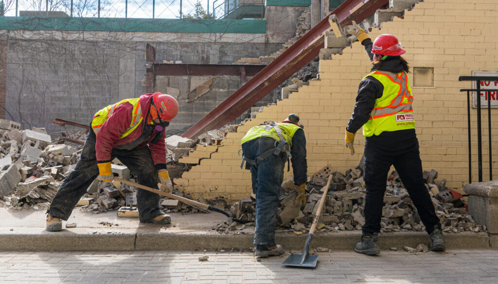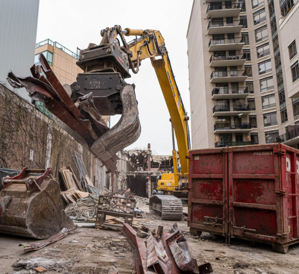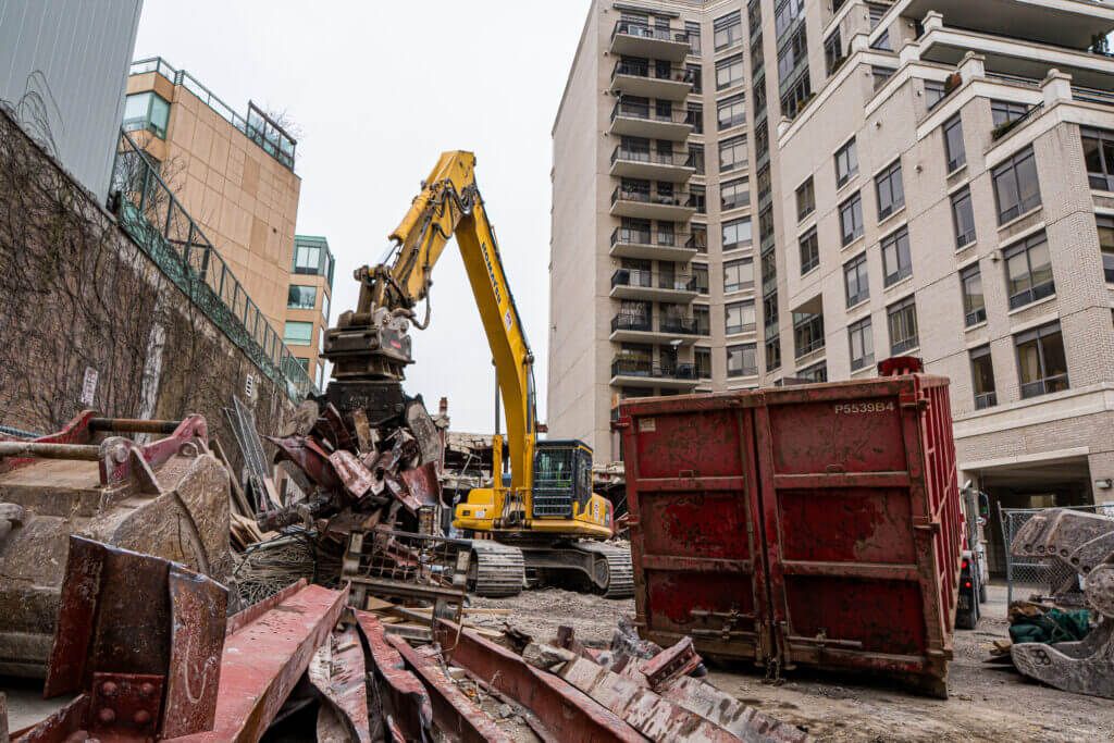 The challenge was space—there was no space between 89 Avenue road and the neighbouring buildings. In order to utilize our equipment safely in this tight space, machines were driven through the building so that the structure could be demolished from the inside out.